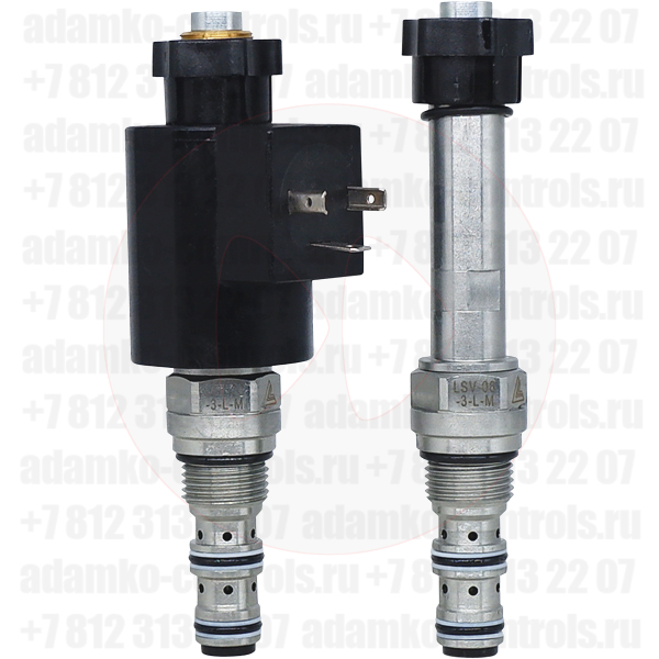 LSV-08-3-L-M Трёхлинейный гидравлический клапан (гидроклапан) картриджного (ввертного) исполнения, с электромагнитным управлением, тарельчатого типа прямого действия, гнездо SAE8/3 (SAE 08), резьба 3/4-16 UNF-2A, 20 л/мин, 350 бар, дублирующее ручное управление (Keta Hydraulics, Китай).
