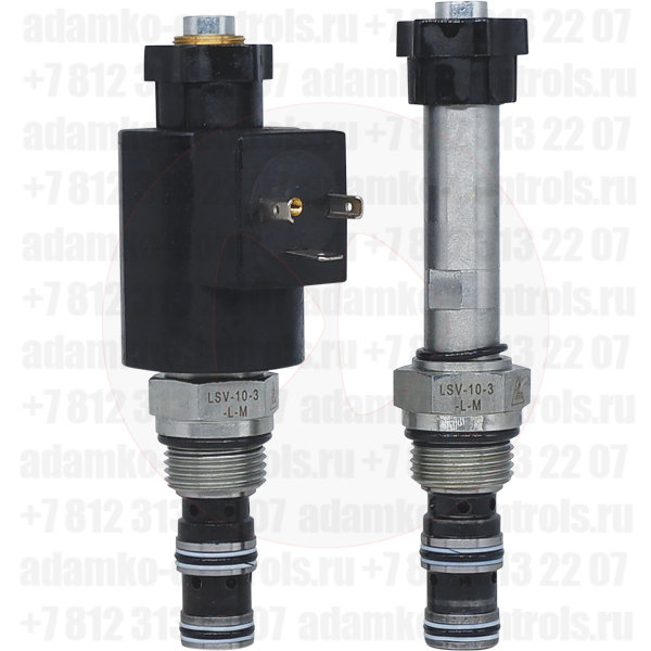 LSV-10-3-L-M Трёхлинейный гидравлический клапан (гидроклапан) картриджного (ввертного) исполнения, с электромагнитным управлением, тарельчатого типа прямого действия, гнездо SAE10/3 (SAE 10), резьба 7/8-14 UNF-2A, 25 л/мин, 250 бар, дублирующее ручное управление (Keta Hydraulics, Китай).