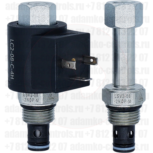 LSV2-08-2NOP-M Двухлинейный гидравлический клапан (гидроклапан) картриджного (ввертного) исполнения, с электромагнитным управлением, нормально открытый, тарельчатого типа с пилотным управлением, гнездо SAE8/2 (SAE 08), резьба 3/4-16 UNF-2A, 37,9 л/мин, 207 бар, дублирующее ручное управление (Keta Hydraulics, Китай).