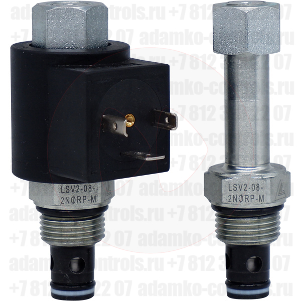 LSV2-08-2NORP-M Двухлинейный гидравлический клапан (гидроклапан) картриджного (ввертного) исполнения, с электромагнитным управлением, нормально открытый, тарельчатого типа с пилотным управлением, гнездо SAE8/2 (SAE 08), резьба 3/4-16 UNF-2A, 30 л/мин, 207 бар, дублирующее ручное управление (Keta Hydraulics, Китай).