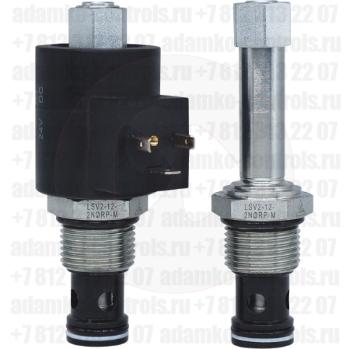 LSV2-12-2NORP-M Двухлинейный гидравлический клапан (гидроклапан) картриджного (ввертного) исполнения, с электромагнитным управлением, нормально открытый, тарельчатого типа с пилотным управлением, гнездо SAE12/2 (SAE 12), резьба 1 1/16-12 UNF-2A, 114 л/мин, 207 бар, дублирующее ручное управление (Keta Hydraulics, Китай).